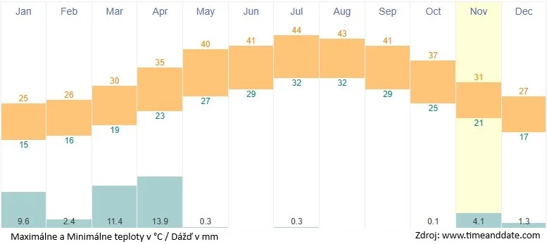 Mesto sa nachádza v nadmorskej výške 7 m a má horúcu púštnu klímu. Priemerná ročná teplota je 28°C a priemerný ročný počet zrážok je iba 57 mm. Najlepšie mesiace sú december a január, s teplotami vzduchu max 25°C / min 21°C a teplotou mora 23°C.